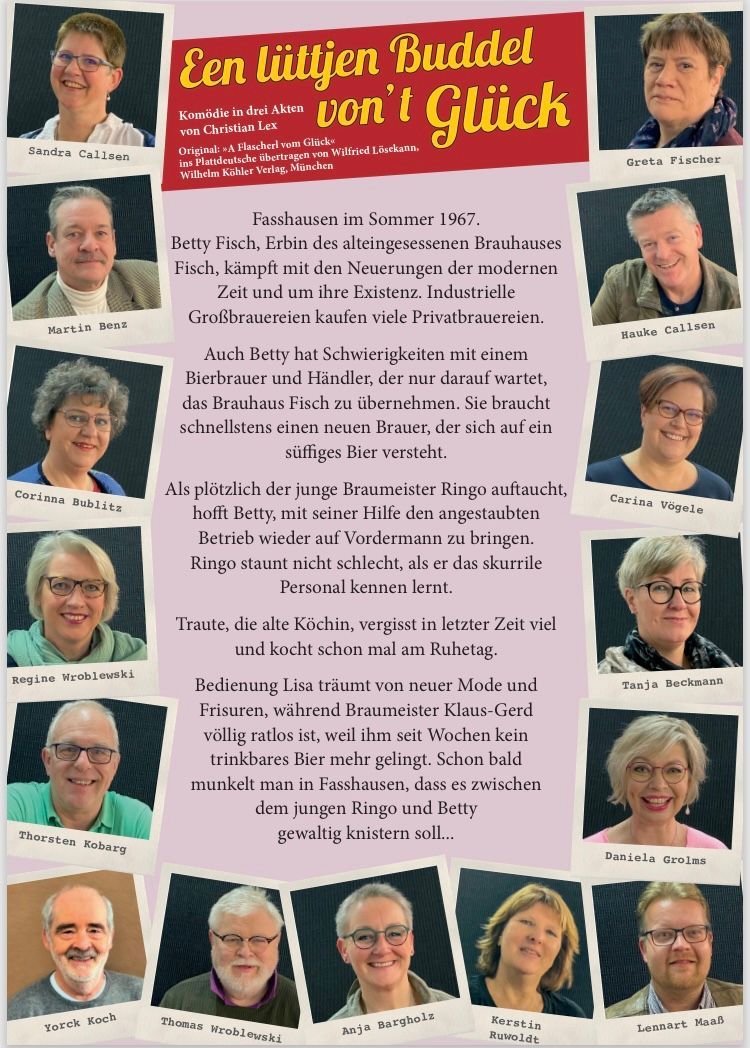 Im Frühjahr 2025 durften wir den 3-Akter "Een lüttjen Buddel von't Glück" von Christian Lex sechs Mal in fast ausverkauften Vorstellungen unserem Publikum präsentieren. Dafür an dieser Stelle ein ganz herzliches Dankeschön an unser großartiges Publikum, das uns teilweise schon seit vielen Jahren die Treue hält.